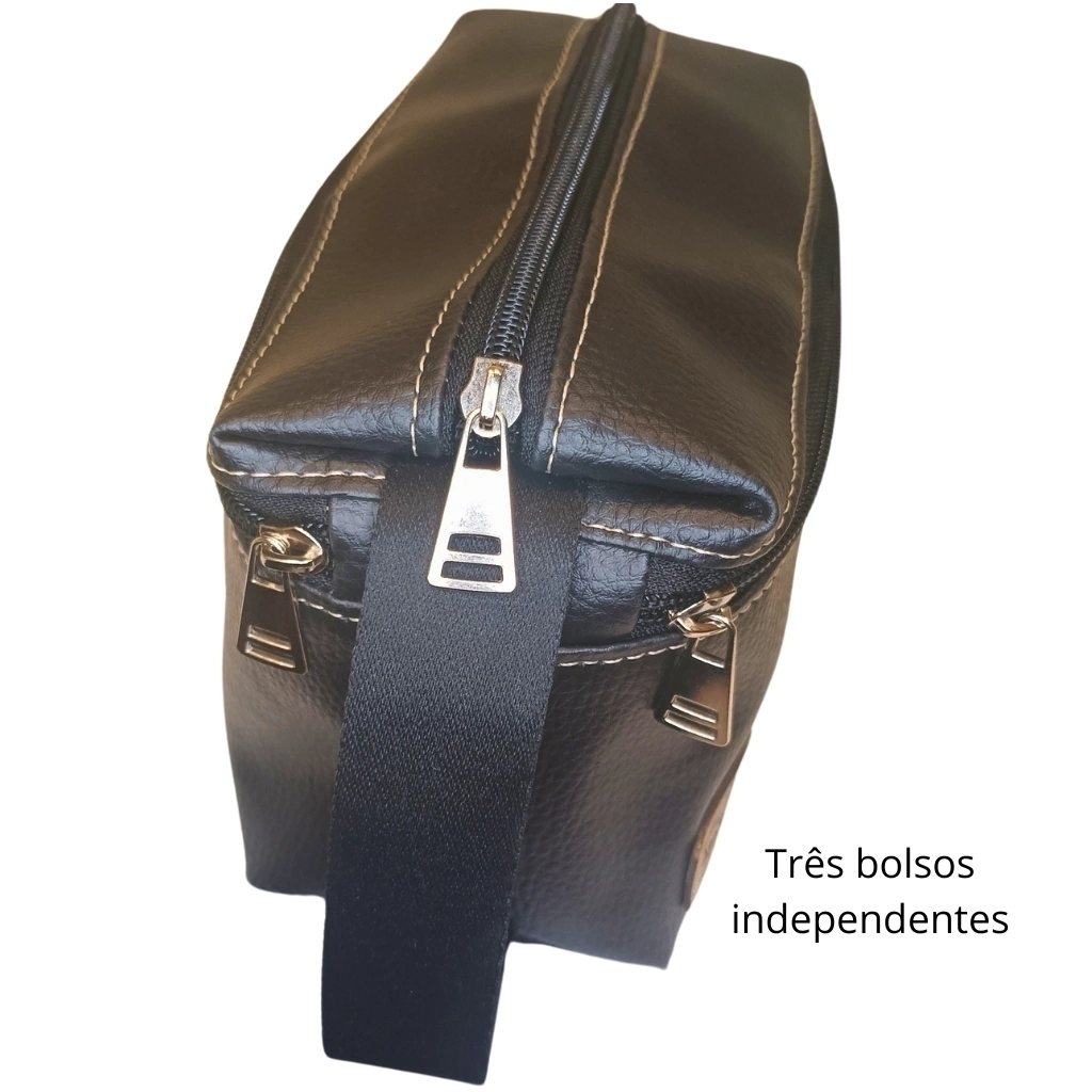 Necessaire com alça de mão lateral que facilita no transporte e manuseio.